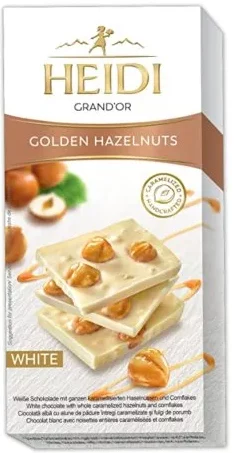 HEIDI baltas šokoladas su lazdyno riešutais – baltasis šokoladas su karamelizuotais lazdyno riešutais.