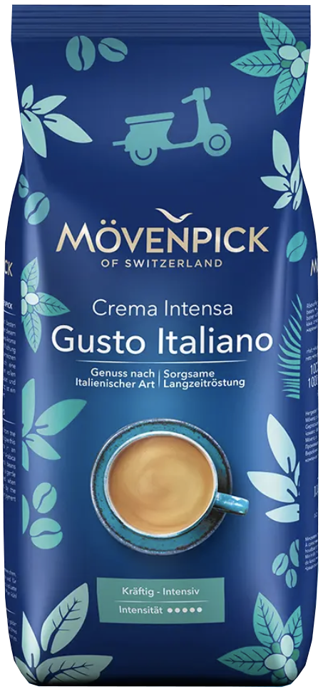 Mövenpick Crema Intensa Gusto Italiano – kruopščiai atrinktos kavos pupelės iš geriausių pasaulio auginimo regionų, suteikia šiai kavai sodrų, intensyvų itališko stiliaus aromatą. Švelnių Arabika ir sodrių Robusta kavos pupelių mišinys išryškina puikų skonį, lėtai jas skrudinant. Šviežiai skrudintos pupelės yra iš karto supakuojamos ir apsaugotos aromatiniu vožtuvu, taip garantuojant pupelių apsaugą nuo nepageidaujamų veiksnių.