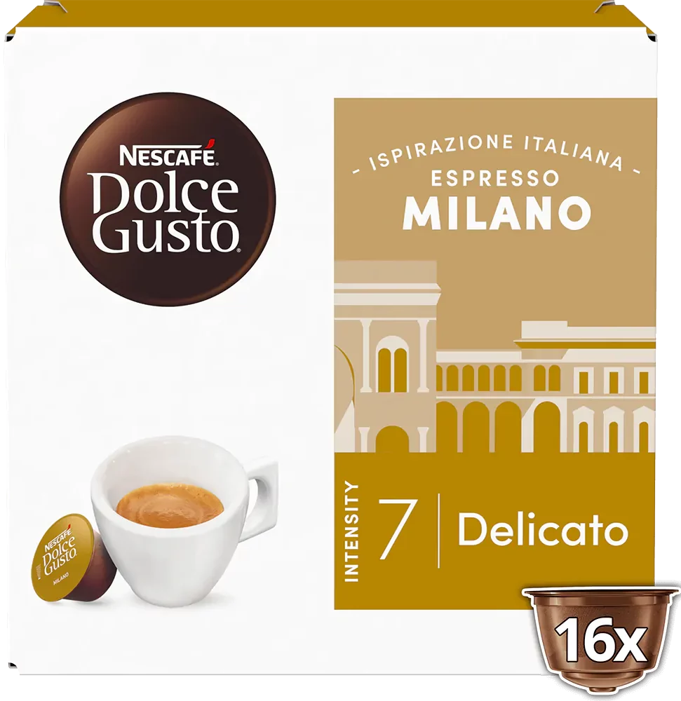 NESCAFÉ DOLCE GUSTO ESPRESSO MILANO – espresso su raudonųjų vaisių ir tamsaus šokolado natomis. Šilkinė, sodraus skonio kava, apgaubta aksomine kavos puta.