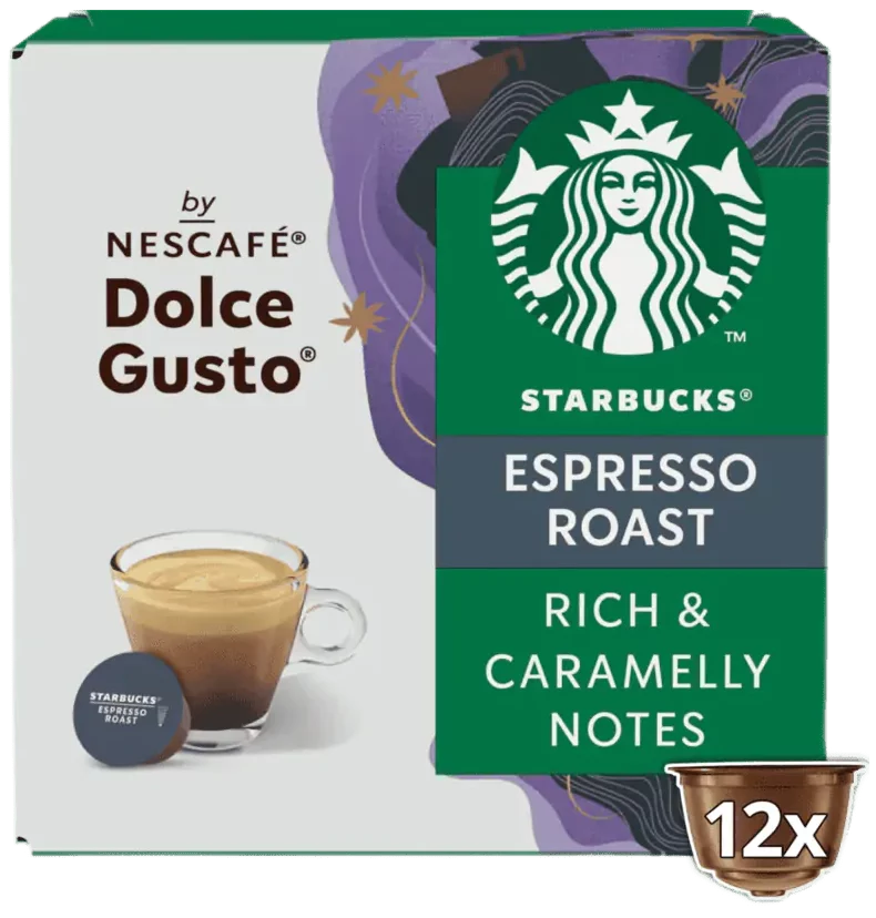 Starbucks Dolce Gusto Espresso Roast – 100% arabika kavos pupelių mišinys iš Lotynų Amerikos ir Azijos/Ramiojo vandenyno regiono. Ši espreso kava pasižymi sodriu skoniu su karamelės natomis.