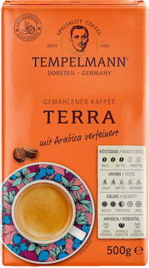 Tempelmann Terra malta kava – tai išraiškingo skonio kava, sukurta iš aukštos kokybės pupelių, siekiant atskleisti natūralų kavos skonį. Ši kava pasižymi intensyviu aromatu, tamsesniu skrudinimu, šokolado ir prieskonių natomis bei ilgai išliekančiu poskoniu. Puikiai tinka mėgstantiems stipresnę, ryškesnio charakterio kavą. Ideali filtriniam ar plikytam kavos paruošimo būdui.